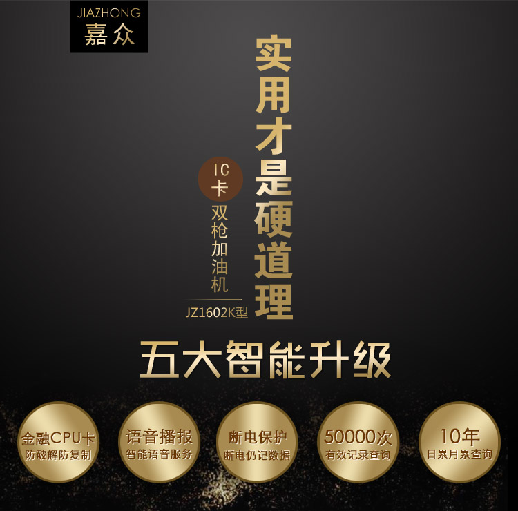 嘉眾雙槍IC卡加油機1602K型是一款加油站防爆插卡加油機,可加柴油和汽油,內帶語音功能,流量每分鐘可達60L-80L,加油機內部采用正星同款流量計和防爆組合泵裝置,安全更放心!